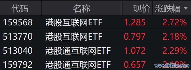 受重仓股上涨影响,跟踪中证港股通互联网指数的港股互联网ETF、港股通互联网ETF大涨逾2%。